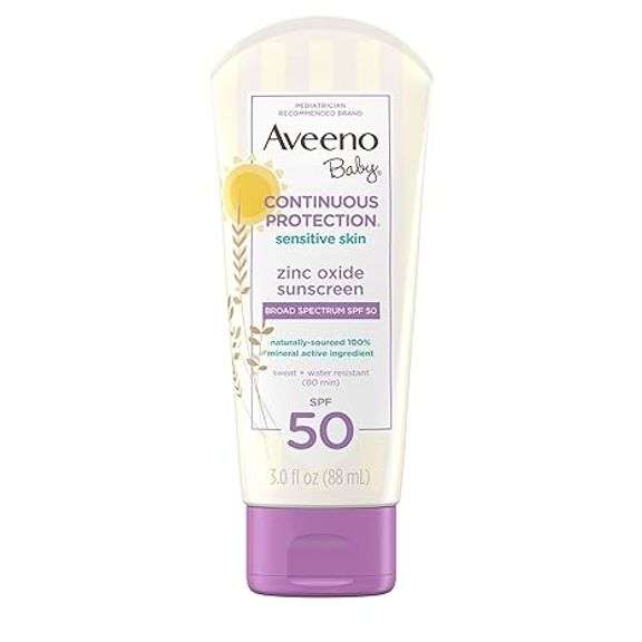 Aveeno Baby Continuous Protection Zinc Oxide Mineral Sunscreen Lotion for Sensitive Skin, Broad Spectrum SPF 50, Tear-Free, Sweat- & Water-Resistant, Paraben-Free, Travel-Size, 3 fl. oz