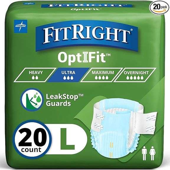 LOT 76 - FitRight Adult Diapers, Ultra Heavy Absorbency, L (Waist Size 44in-56in), 20 Count