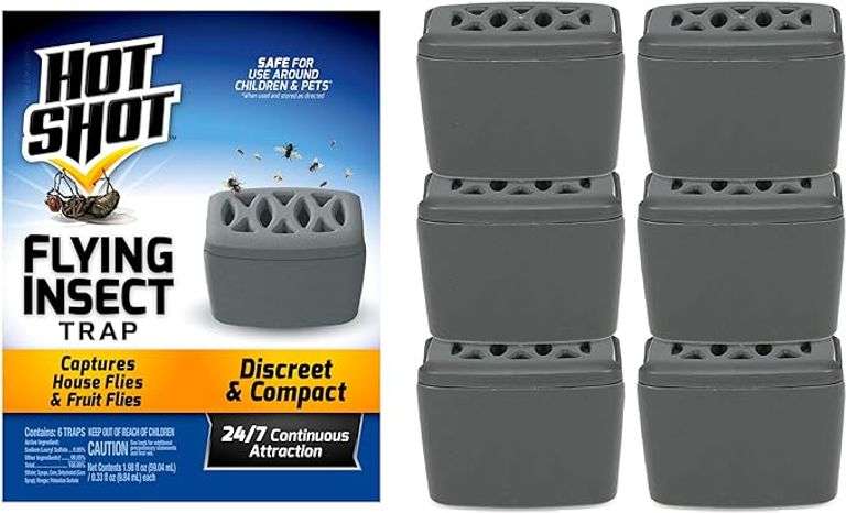 Hot Shot Flying Insect Trap, Discreet, Trap Attracts and Captures House Flies and Fruit Flies, 24/7 Continuous Attraction, No Plug-in Or Electricity Needed, 6 Count